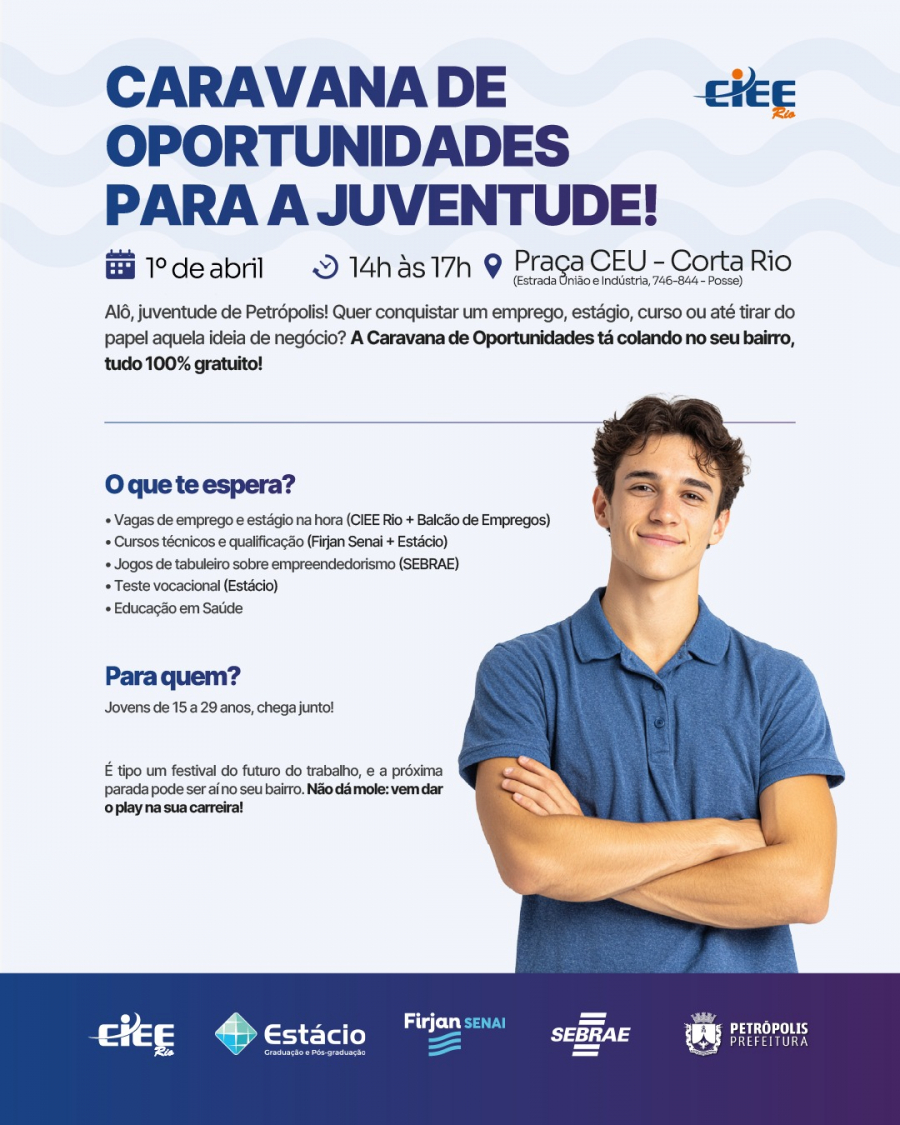 A Praça CEU das Artes, na Posse, recebe nesta quarta-feira (1/4) a primeira edição da Caravana de Oportunidades para a Juventude, promovida pela Prefeitura. A ação acontece das 14h às 17h, com serviços gratuitos voltados ao público de 15 a 29 anos.